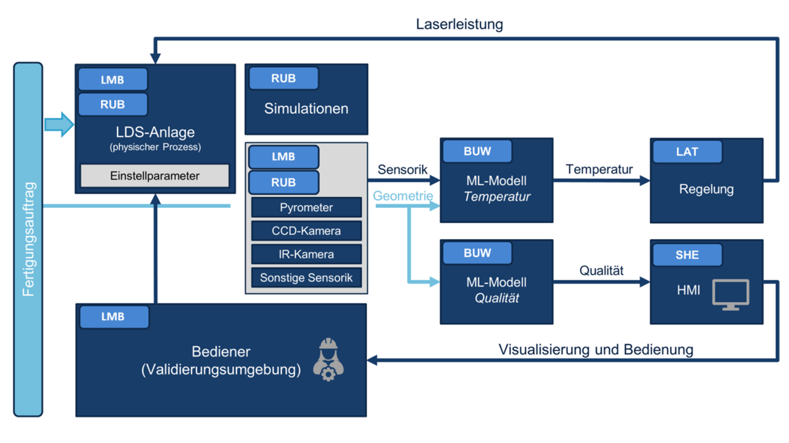 Im Rahmen dieses Projektes soll eine Lösung erarbeitet werden, die das Laserschweißen von verschiedenen Polymeren mit einer hohen Schweißnahtqualität ermöglicht. Hierfür ist eine präzise Steuerung der Schweißparameter erforderlich, um die in-tendierte Prozesstemperatur in der Fügezone zu erreichen. Die Ermittlung der Temperatur erfolgt dabei durch einen KI-basierten virtuellen Echtzeit-Temperatursensor, der die Sensordaten des Pyrometers und der Wärmebildkamera verarbeitet und eine Eingangsgröße für die Regelung der Laserparameter zur Verfügung stellt. Neben der Temperatur muss auch ein KI-Modell für die online Qualitätsabschätzung und visuelle Entscheidungsunterstützung entwickelt werden, der aus den Sensordaten der Wärmebildkamera und sonstigen Sensoren (z.B. CCD- oder CMOS-Kamera) eine Information über die Schweißnahtgeometrie liefert, da die Geometrie für die Festigkeit der Schweißnaht die entscheidende Größe ist.